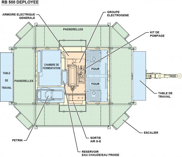 The field bakery RB 500 allows the users to produce 250 to 500 Kg of bread every 12 hours thanks to all appliances of a traditional bakery.
