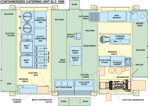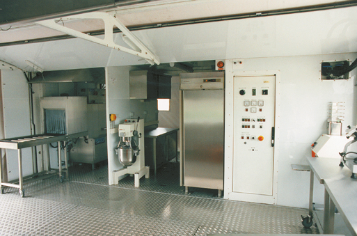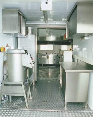 The kitchen set of two modules includes preparation, cooking and serving of the meals and has its own dishwashing facility. It is entierly autonomous with its own power production.