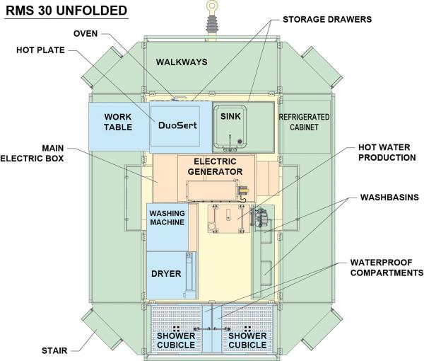 The SERT multipurpose trailer RMS 30 has been designed for the life support of 30 people in the field.