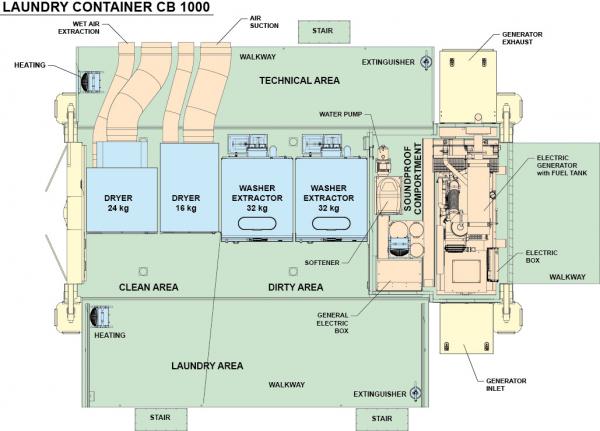 LoginThe containerized laundry unit CB 1000 is designed to support 500 to 1000 people in the field.