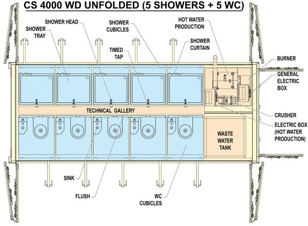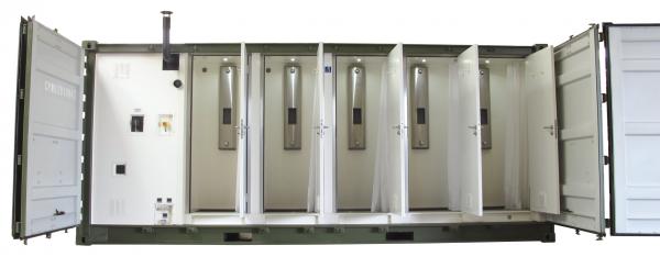The users have in standard a combination of 5 WC seat cubicles with individual washbasin and 5 shower cubicles. They are integrated in a double open side 20ft ISO sea container totally insulated and partitioned by sandwich panels.