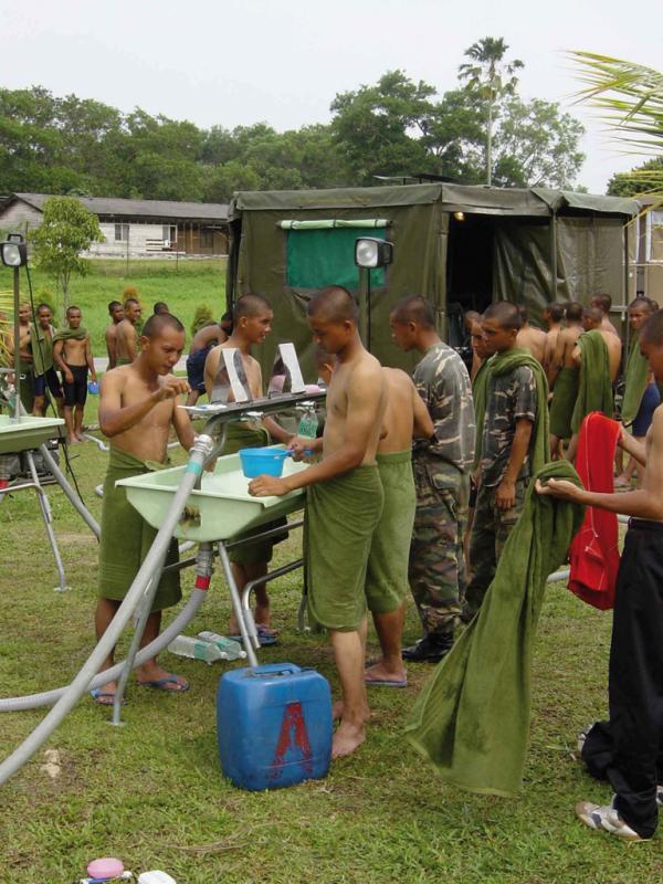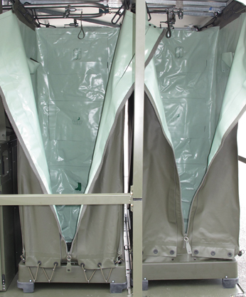 It is equipped with eight shower cubicles and four sink areas easy to deploy, connected to a centralized drainage network (in option external washbasins can be provided).