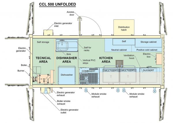The new CCL 500 Kitchen-dishwasher container is designed to provide fast and efficient catering for 150 to 500 people in a compact and fully sheltered environment.