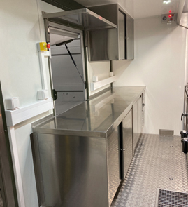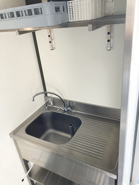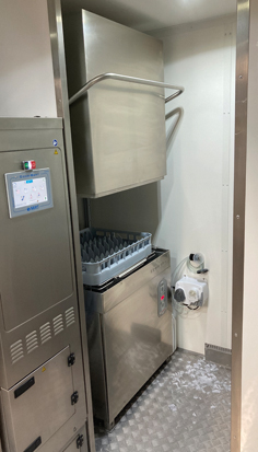 The kitchen area consists of four SERT cooking modules all stainless steel with gastronorm dimensions ensuring the function of kettle, frying pan, fryer, oven / hotplate and combi-steamer oven.