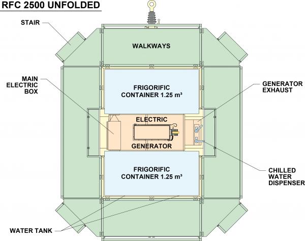 It is equipped with two independent and efficient frigorific containers of 1.25 m³ each for an external temperature above 49°C. The all stainless steel chassis of the unit ensures a maximum longevity and their industrial design has proven their durability in all tests.