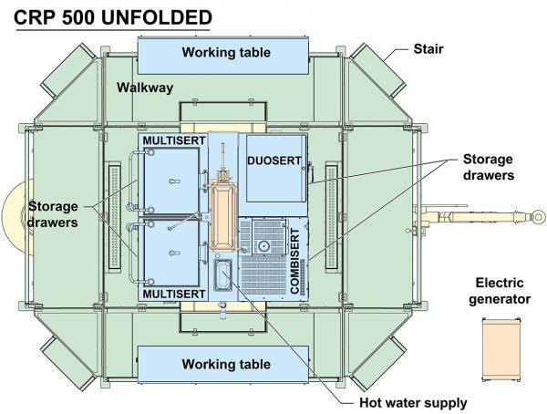 The unit is fully autonomous with its own power set and SERT’s high efficiency multi liquid fuel burners that ensures the fast rise in temperature. Four folding walkways covered by four corresponding awnings form a perfect shelter for the weather and a 14 m² work area well above the ground (70 cm).